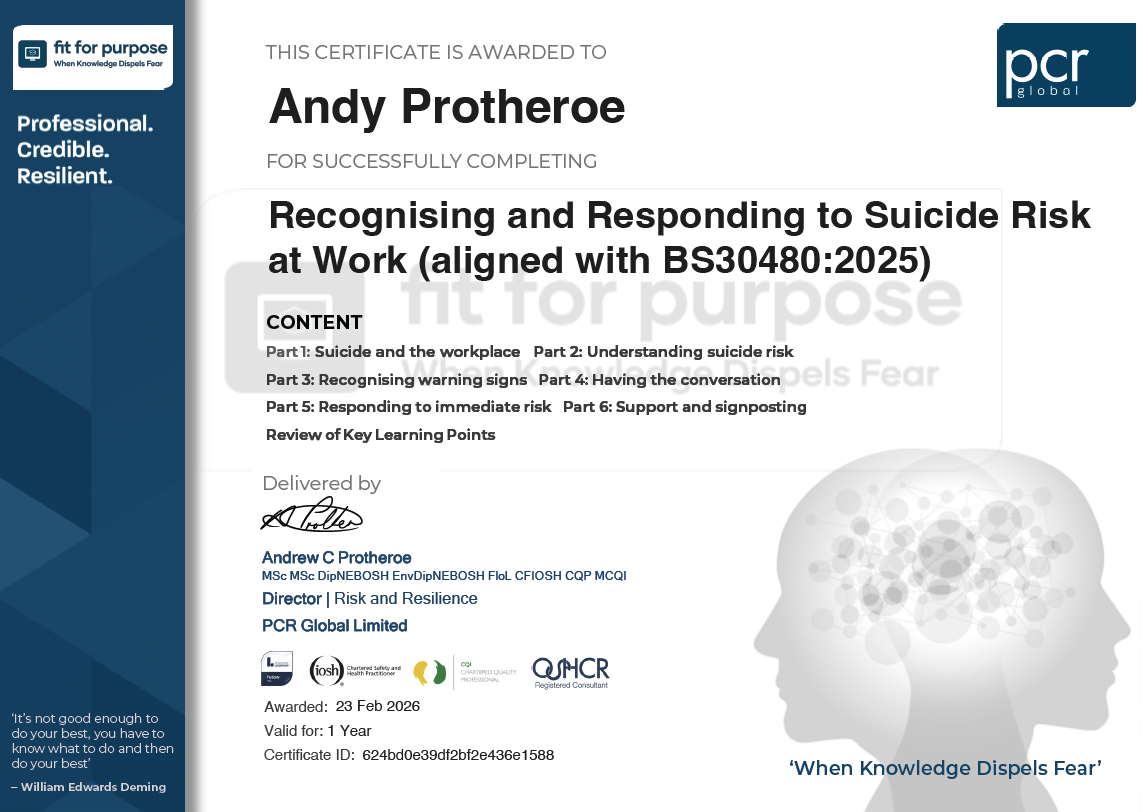 This course provides practical “thinking points” to help people recognise and respond safely to suicide risk in the workplace, aligned to BS 30480:2025.