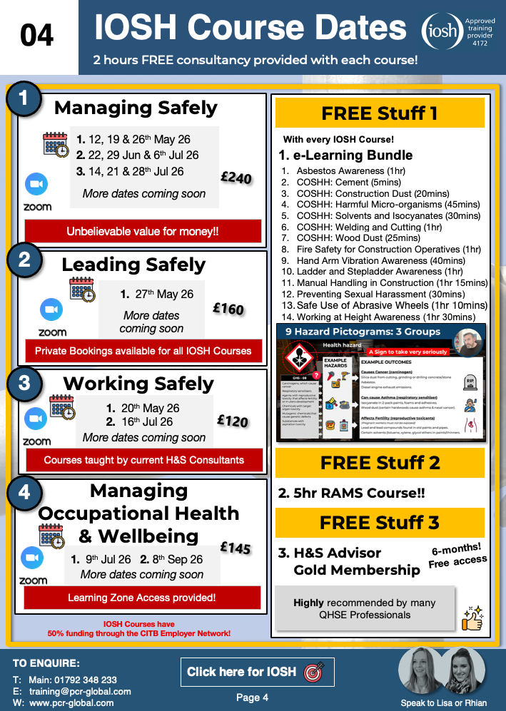 Complete any of our IOSH courses and get Free 5 hour RAMS course, e-Learning bundle, 2 hours Free consultancy and 6 months access to H&S Advisor Gold Membership which gives you access to half price PCR Global courses!!